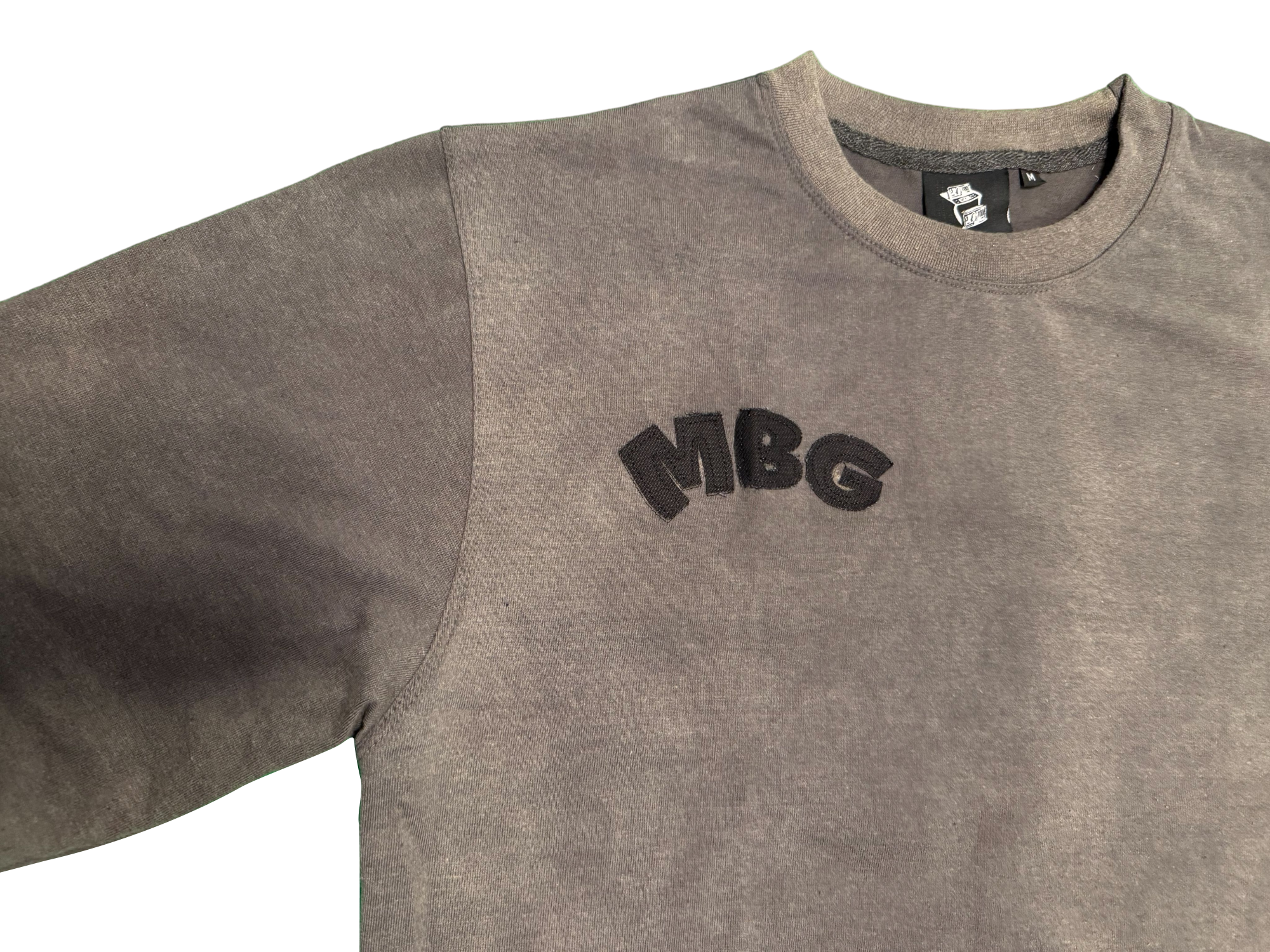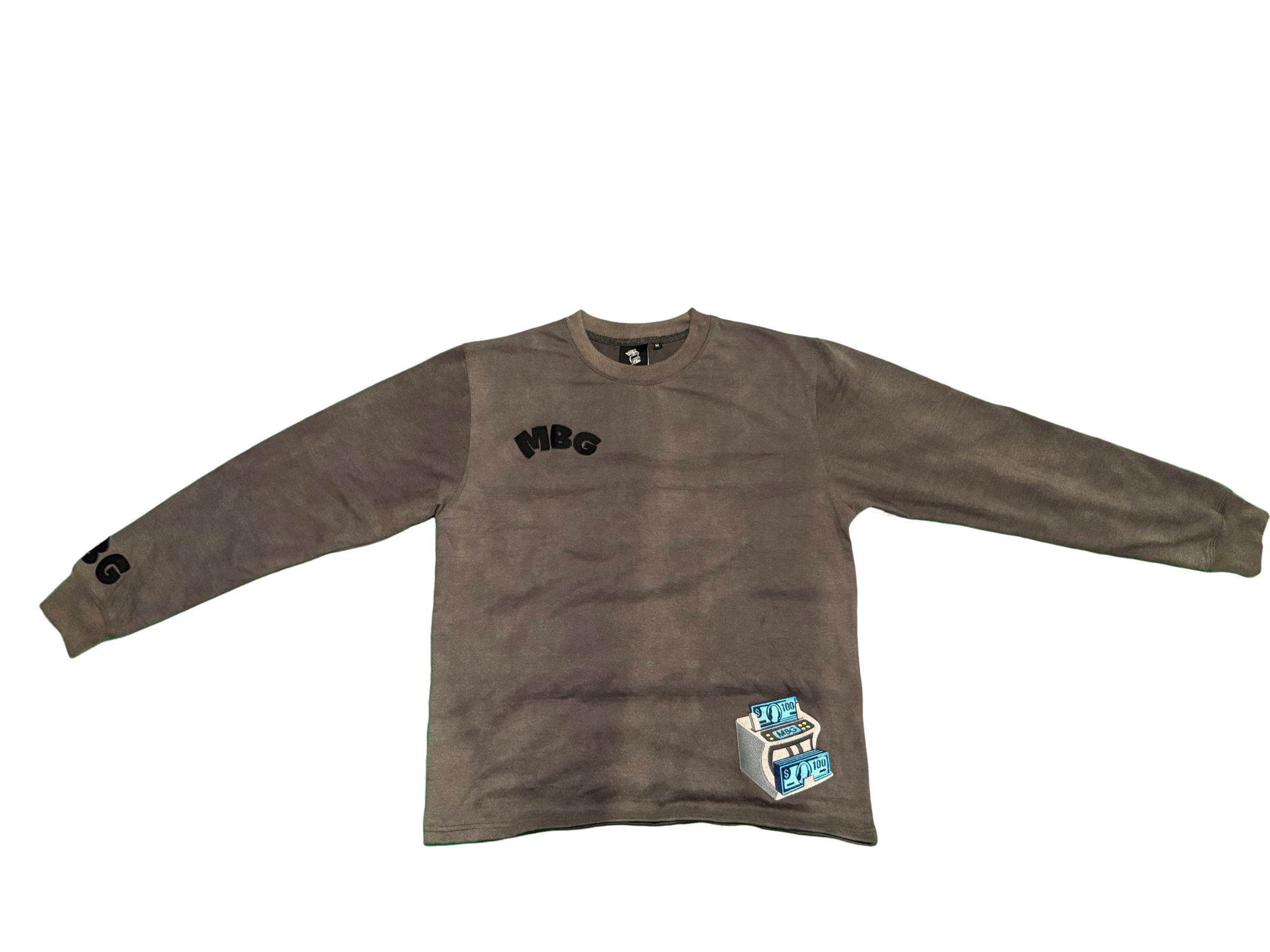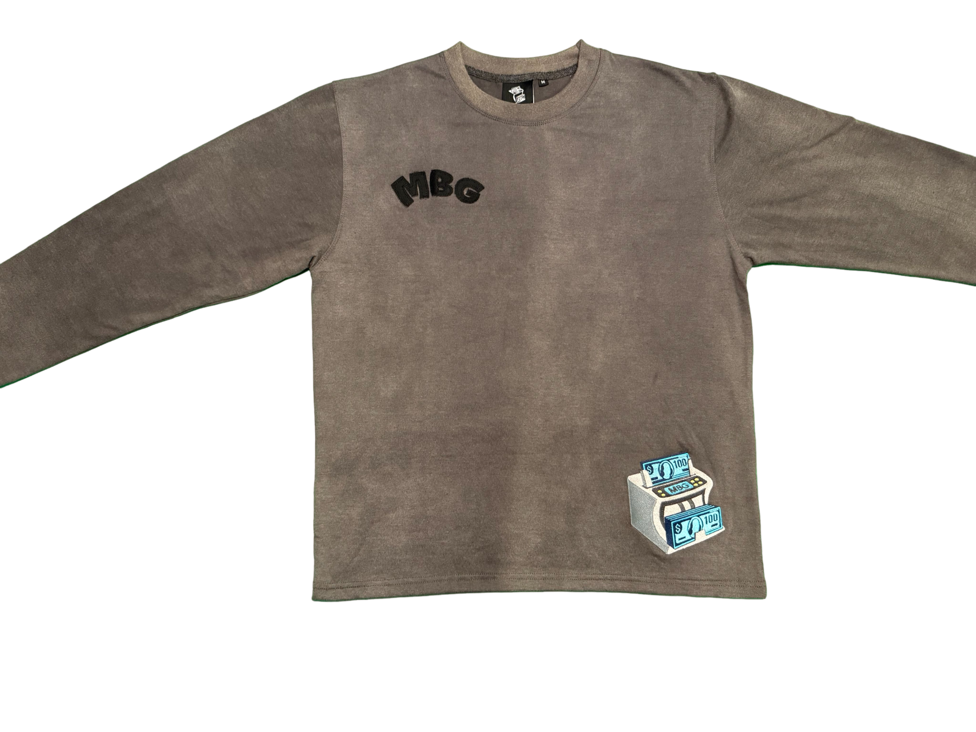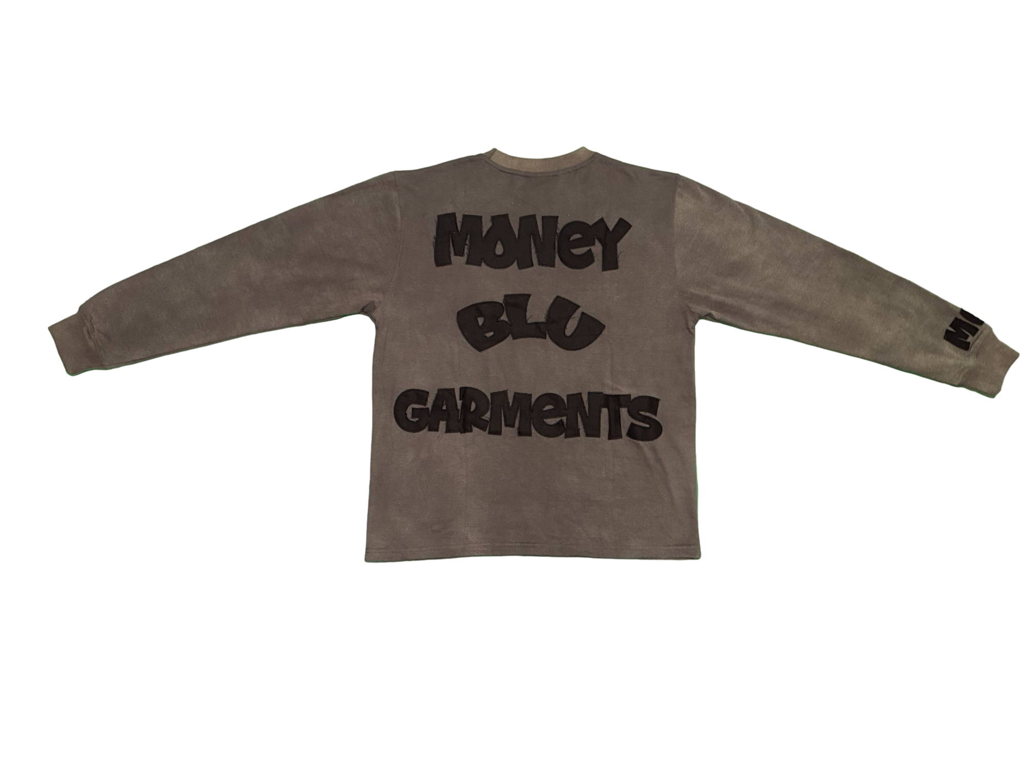 Acid washed long sleeve garment made 80% cotton 20% polyster. With distressed embroidered lettering on front, back & sleeve of garment. The iconic MBG embroidered logo on front left bottom of garment.