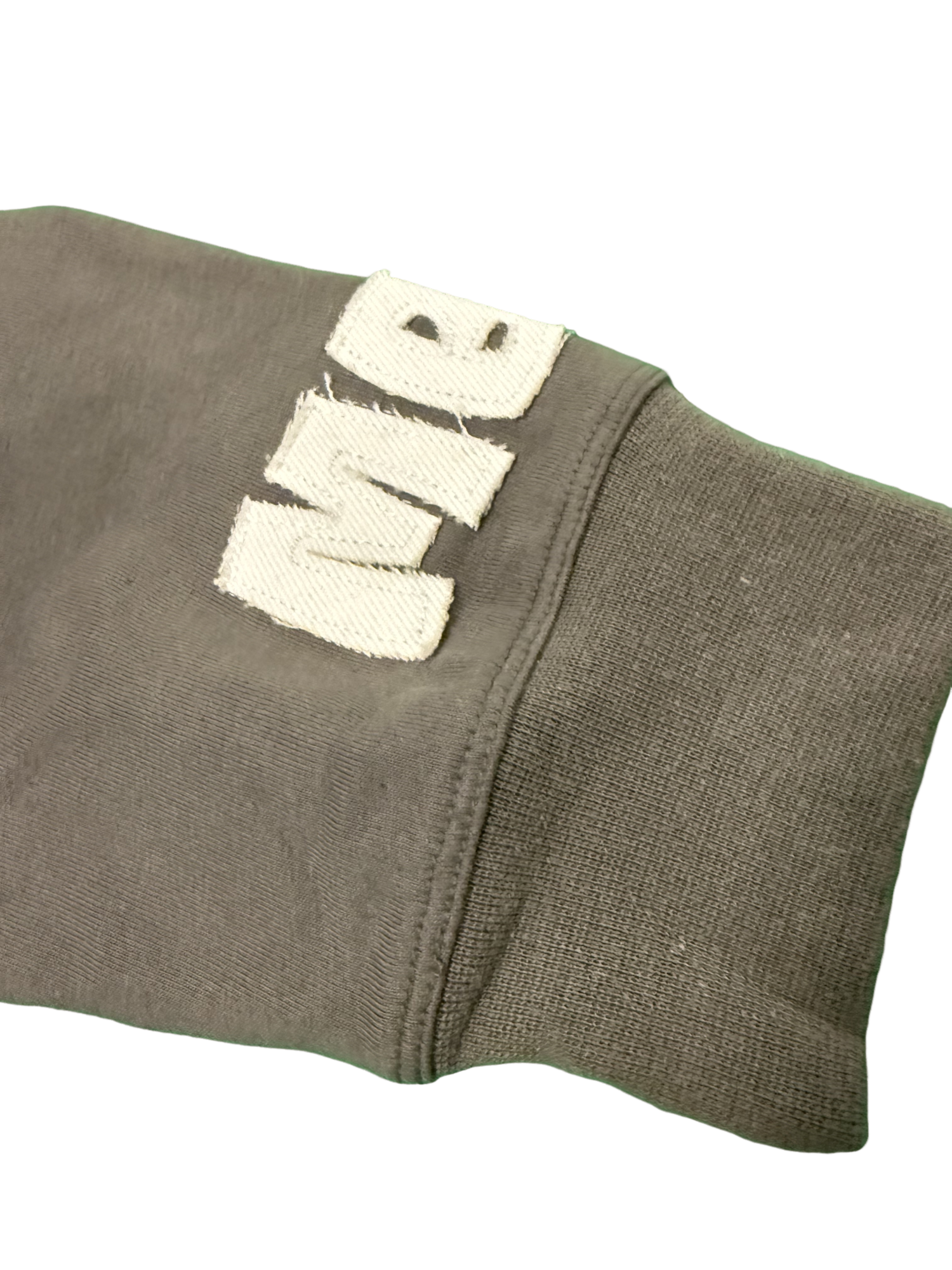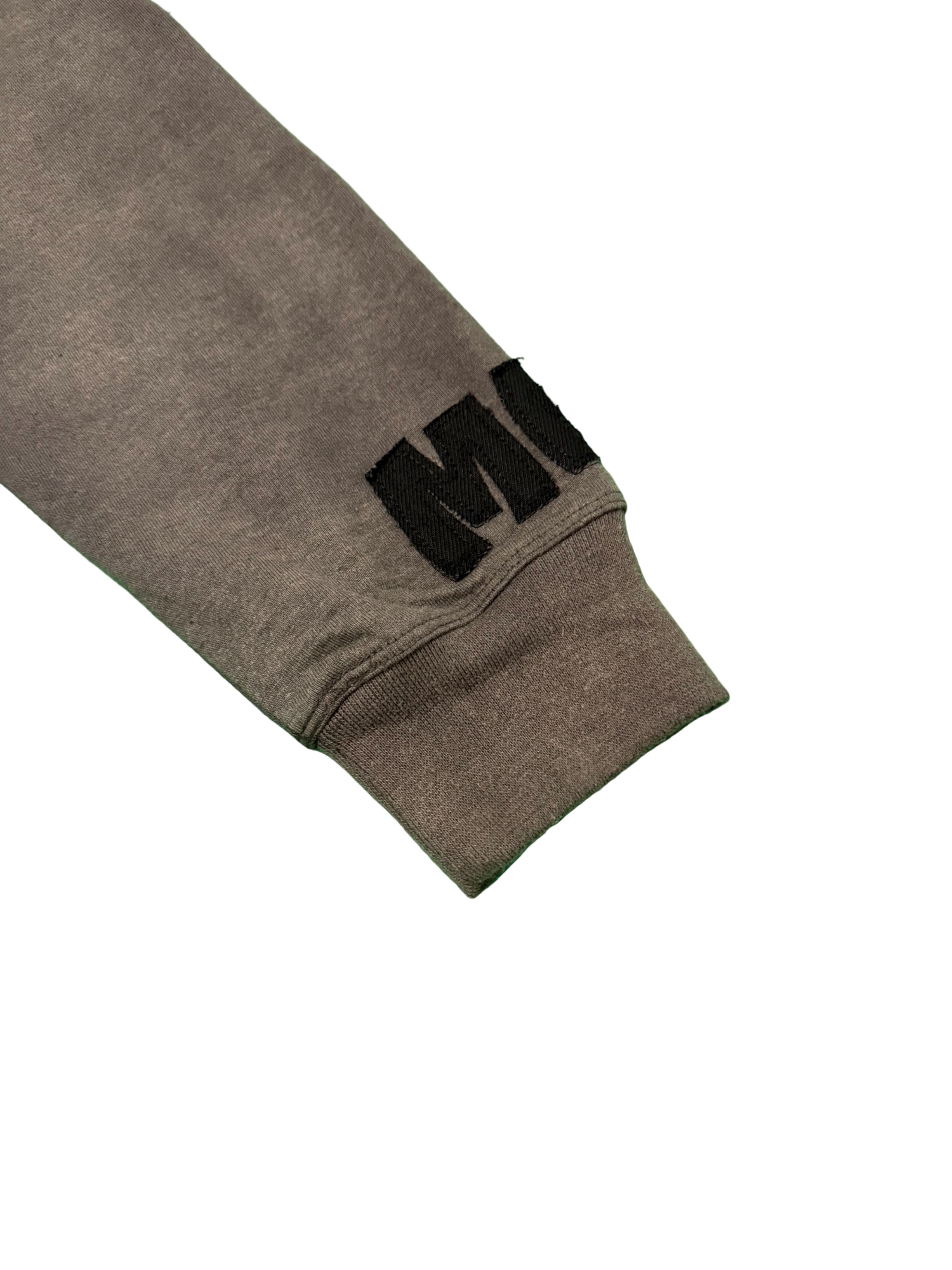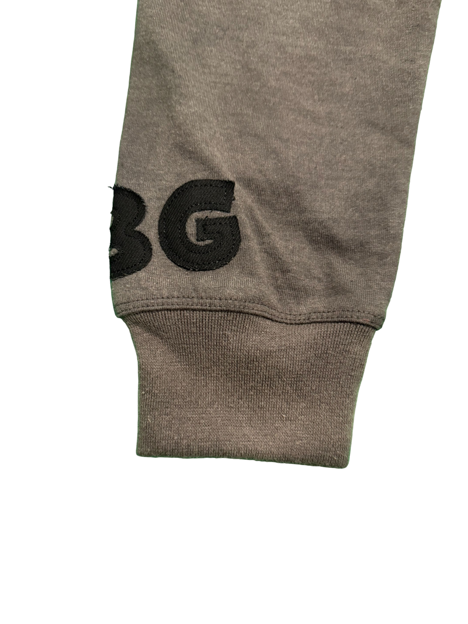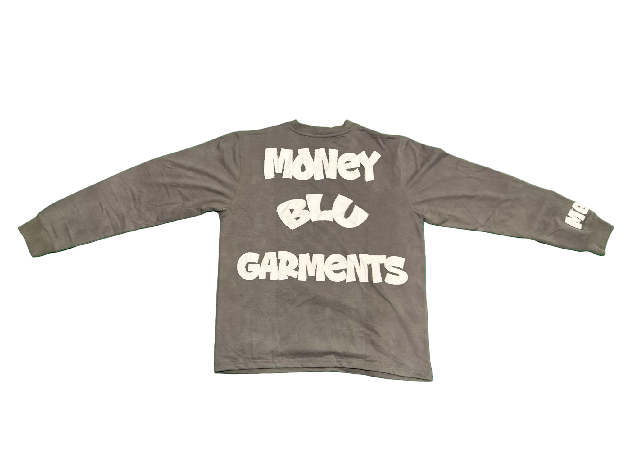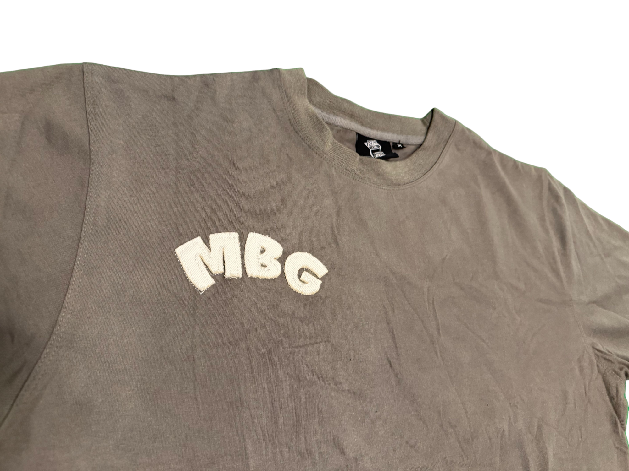 Acid washed long sleeve garment made 80% cotton 20% polyster. With distressed embroidered lettering on front, back & sleeve of garment. The iconic MBG embroidered logo on front left bottom of garment.